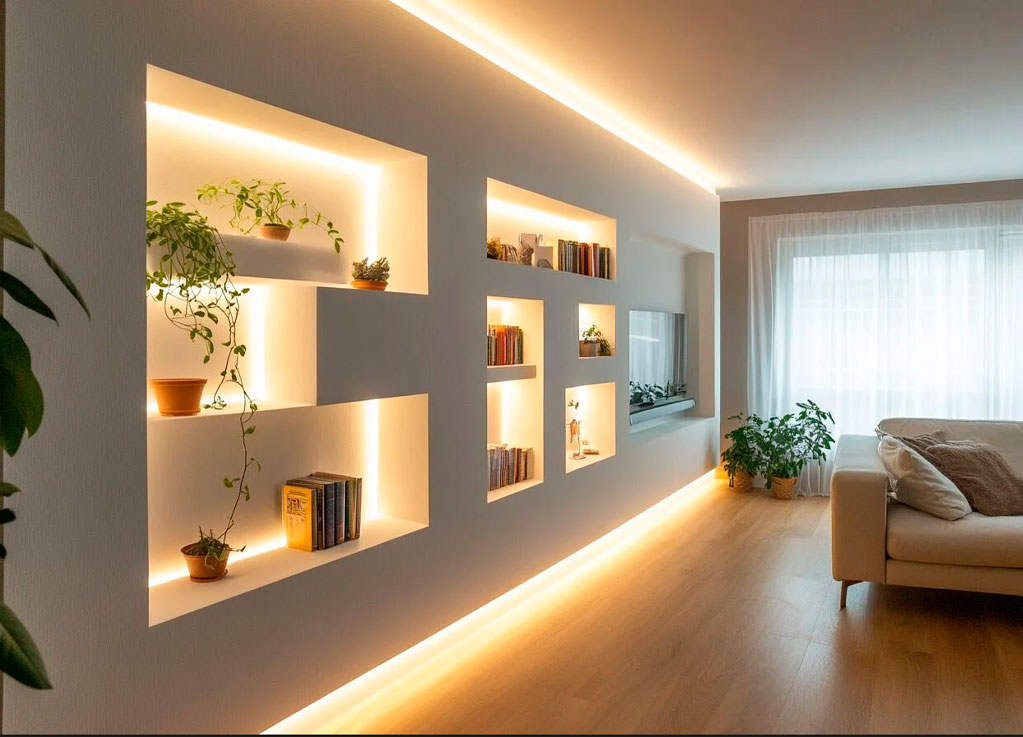 Diseñamos e instalamos decoraciones de interiores y exteriores con tablaroca (panel de yeso), ofreciendo soluciones versátiles como muros divisorios, techos falsos, nichos, libreros integrados, centros de entretenimiento modernos y mucho más